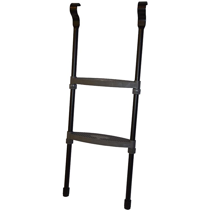 Schwarze Trampolinleiter mit 2 Stufen. Die Trittstufen haben ein Anti-Rutsch-Profil und können dank verschiebbarer Kappen am Boden für jedes Trampolin maßgefertigt werden.