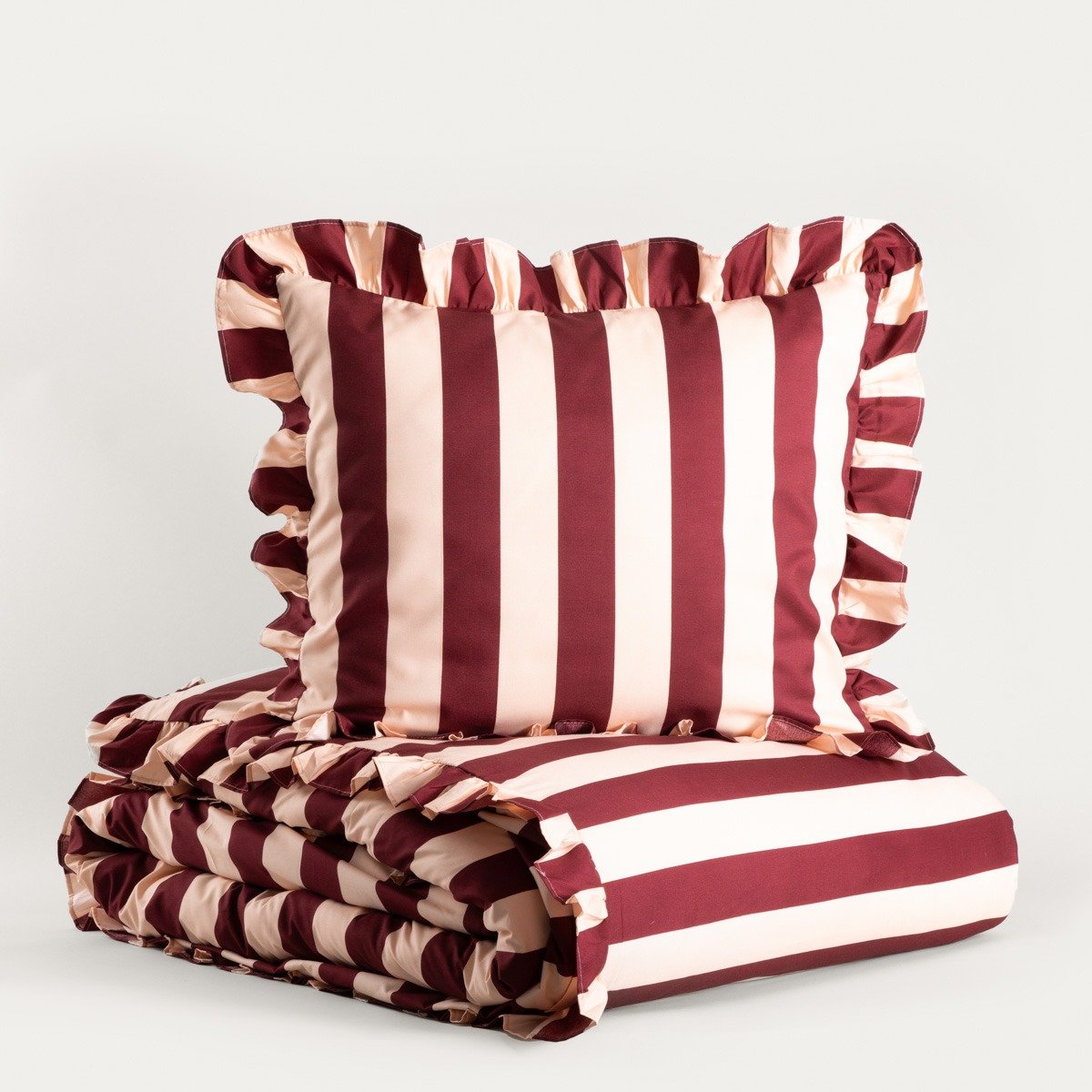 If you're dreaming of a stylish bedroom with a subtle romantic touch, the TIFFANY bedding will meet your expectations. The stylish stripes in maroon tones, finished with a decorative frill, will bring a cosy and unique atmosphere to your interior. It will be perfect both for everyday use and as a practical gift for a loved one.
