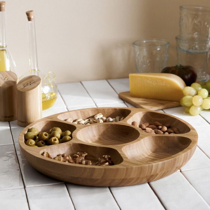 Der BAMBOU Platter von HOMLA ist ein stilvolles und elegantes Produkt, das Ihre Partys organisiert und auch an gewöhnlichen Tagen für Abwechslung auf dem Tisch sorgt. Mit ihm können Sie eine Vielzahl von Snacks servieren, sei es Süßigkeiten, Früchte oder Gebäck. Die hochwertige Verarbeitung hebt ihn von anderen Produkten ab und verleiht Ihrer Tischdekoration eine geschmackvolle Note. Das Original- und Ungewöhnliche Design bringt eine positive Ausstrahlung auf Ihr Geschirr und macht ihn zu einem nützlichen und hilfreichen Utensil, das in jedem Haushalt nicht fehlen sollte.
