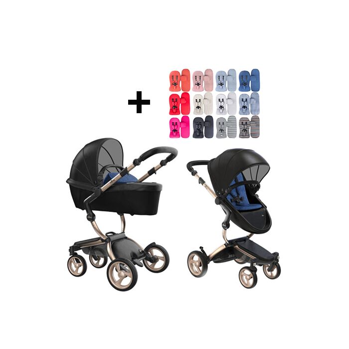 Mima Xari Kinderwagen | Gestell - Champagne | Sitz + Haube - Black | Starter Pack - Denim Blue