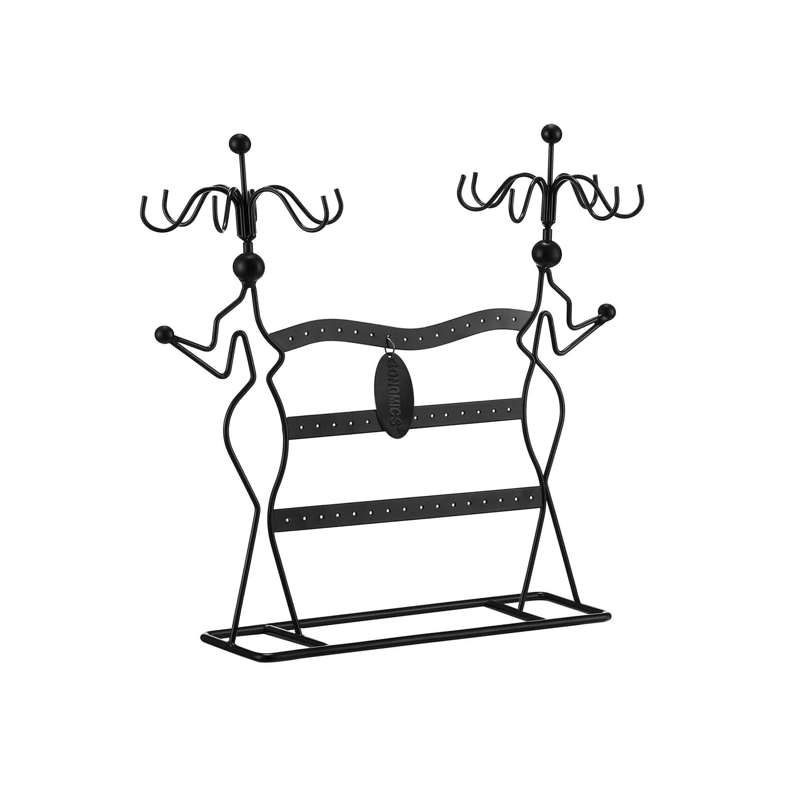 Parameters: Color:black Dimensions: 34.5 x 12.5 x 34 cm (W x D x H) Distance between two adjacent holes for earrings: 1 cm Shipping List: 1 x Jewellery Rack