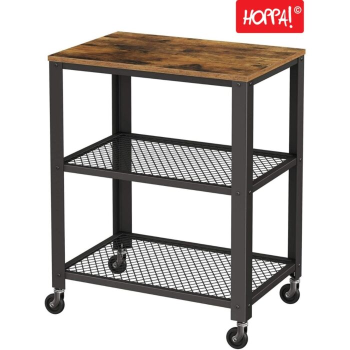 Informationen zum Produkt: - Farbe: vintage, schwarz - Material: Holzkopf (P2), schwarz - Maße: 60 x 76,5 x 40 cm (B x H x T) - Gewicht: 11,21 kg - max. Belastbarkeit: 80 kg oberster Boden, 40 kg pro Fach Lieferumfang: - 1 x Küchenwagen - 1 x Anleitung (DE, EN, FR, IT, ES)