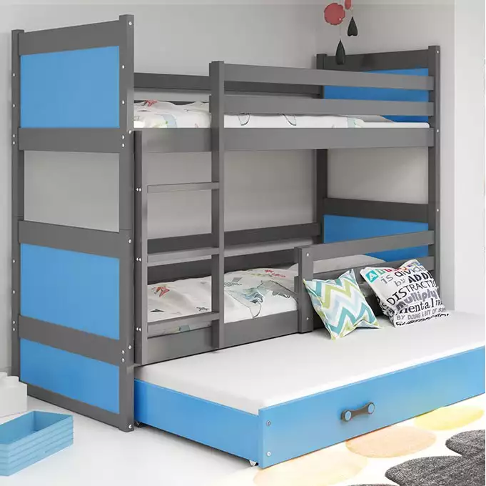 Triple Youth Bed RICO 90x200 with Mattress and Drawer, Graphite/Blue