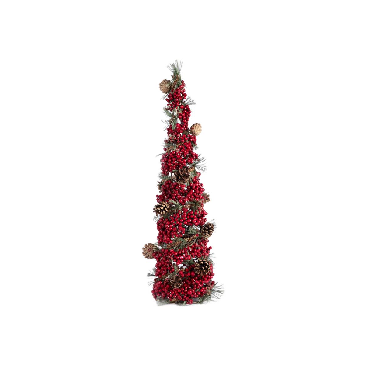 The slender Christmas tree attracts attention with rich decorations in the form of red berries and natural pinecones, which create a beautiful festive composition. The spiralling twigs give it a dynamic look. The pinecones add to its rustic charm, fitting perfectly with the natural Christmas decor.