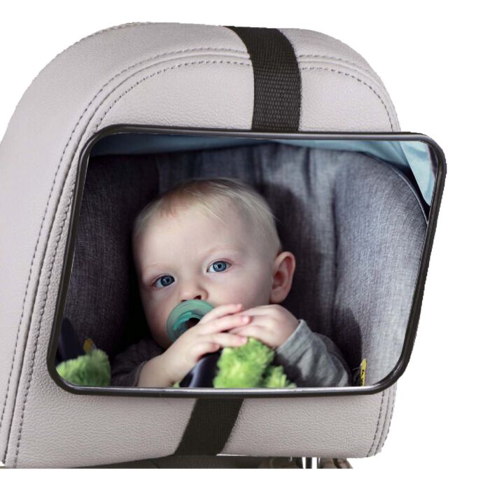 Grote achteruitkijkspiegel voor op de achterbank van je auto. Hij is licht gebogen en geeft volledig zicht op je kind zonder dat je je hoeft om te draaien. De bandjes zijn gemaakt van het milieuvriendelijke en duurzame rPet.