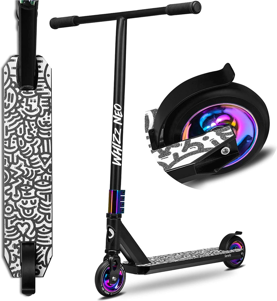 The Lionelo WHIZZ NEO is a versatile freestyle scooter designed for both novice freeriders and more experienced riders. It is built with special materials and a thoughtful design to facilitate learning tricks and enhance performance.