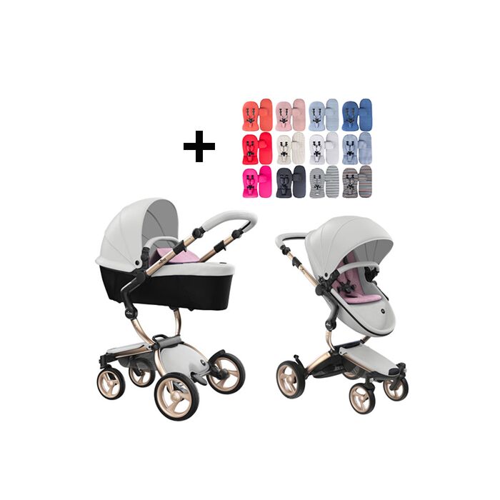 Mima Xari Stroller | Frame - Champagne | Seat + Canopy - Snow White | Starter Pack - Pixel Pink