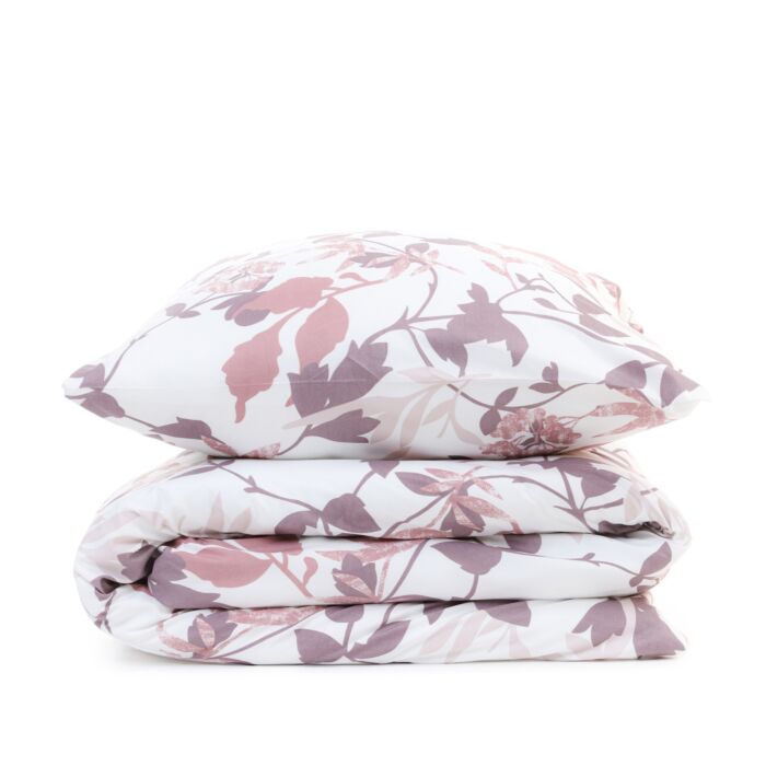 De ROSA beddenset bestaat uit een kussensloop van 160 x 200 cm en een kussensloop van 70 x 80 cm. Op de witte achtergrond staan verschillende bladeren. Het bloemmotief is gehouden in gedempte roze tinten. Het beddengoed wordt gesloten met een rits.