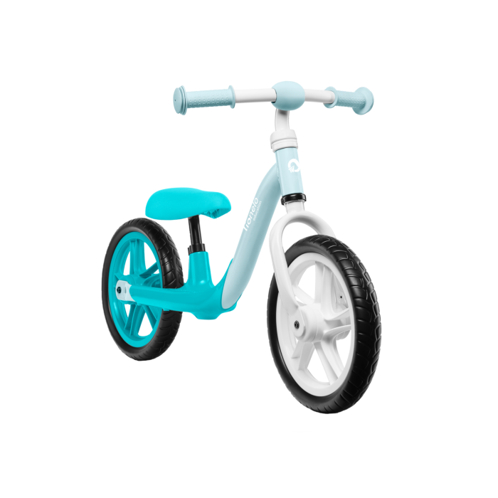 The Lionelo Arie balance bike in turquoise is designed for children looking to hone their motor skills while enjoying the ride. This bike features well-built 12-inch EVA foam wheels, providing both stability and a light weight for effortless maneuvering.