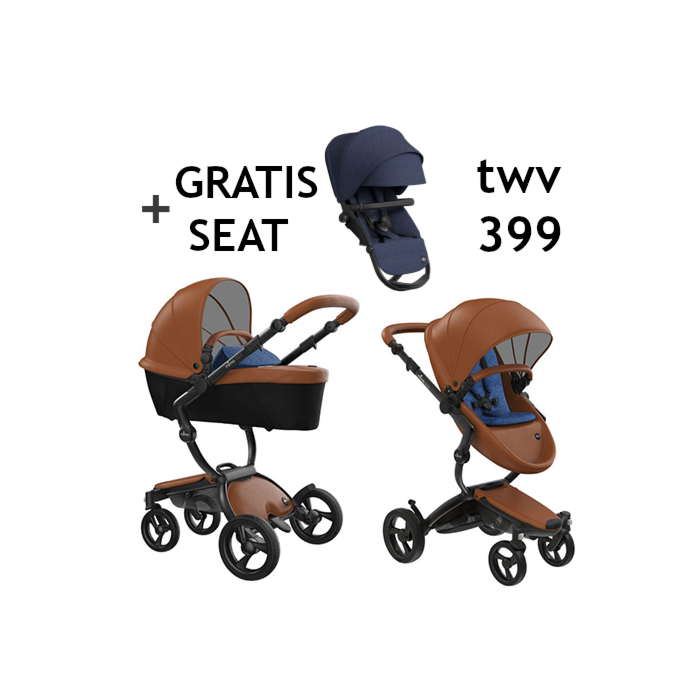 Mima Xari Stroller | Frame - Black | Seat + Canopy - Camel | Starter Pack - Denim Blue