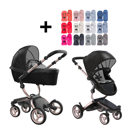 Mima Xari Stroller | Frame - Rose Gold | Seat + Canopy - Black | Starter Pack - Black & White