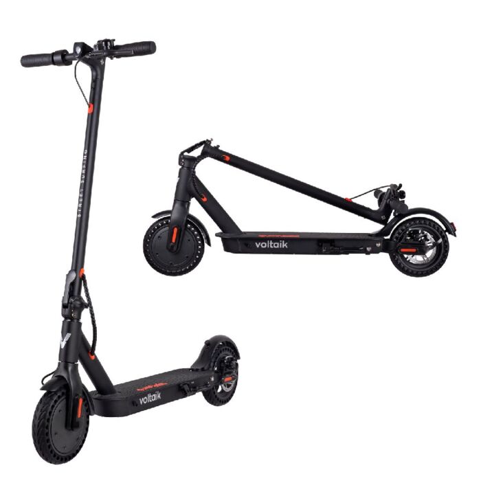 Electric Voltaik SRG 250 E scooter from Street Surfing. Improve your lifestyle with this E-scooter and reach your destinations in an environmentally friendly way! The frame is made of aluminum and comes in the color black. Maximum speed: 25 km per hour. Fully charged you can drive 20 km with it. With 250W front motor and a 36V/6AH lithium battery. You can store the scooter compactly, thanks to the 3-step folding mechanism with quick release. The scooter is equipped with LED lighting at the front, rear suspension and it rides on maintenance-free 8.5 inch anti-puncture tires for extra comfort. There are cool functions on the E-scooter: there is a multifunctional dashboard with an all in one configuration button. You connect to the E-scooter with Bluetooth, there is an app for control and ride information. With cruise control option. You can remotely lock the E-scooter with the app. Product weight: 13 kg. Maximum carrying weight: 120 kg. Suitable for children from 14 years.