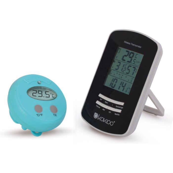 Check the pool water temperature without stepping outside with the Interline Wireless Thermometer. The base station can be mounted on a wall or placed on a countertop indoors. The sensor floats in the pool to measure water temperature and transmits data to the base station. With the ability to display indoor temperature, humidity, outdoor pool temperature, temperature trends, time, and moon phase, this thermometer provides comprehensive information for proper pool maintenance.   ## Dimensions and Material The sensor projects temperature data wirelessly up to 30m in an open field. The base station operates on 2 x 1.5V AA batteries (not included), while the sensor runs on 2 x 1.5V AAA batteries.   ## Functionality and Design The design allows for easy setup and quick temperature readings for both indoor and outdoor environments. The base station provides a clear display of relevant temperature and environmental data, ensuring convenient monitoring.   ## Usage and Application Ideal for pool owners seeking a convenient way to monitor pool water temperature without the need to physically check the pool. The alarm and memory functions enhance temperature monitoring for optimal pool maintenance.   ## Features - Indoor and outdoor temperature monitoring - Waterproof sensor for pool water temperature - Display of indoor temperature, humidity, outdoor pool temperature - Temperature trends, time, and moon phase display - Alarm and memory functions for max/min temperature - Wireless range up to 30m; supports Celsius and Fahrenheit