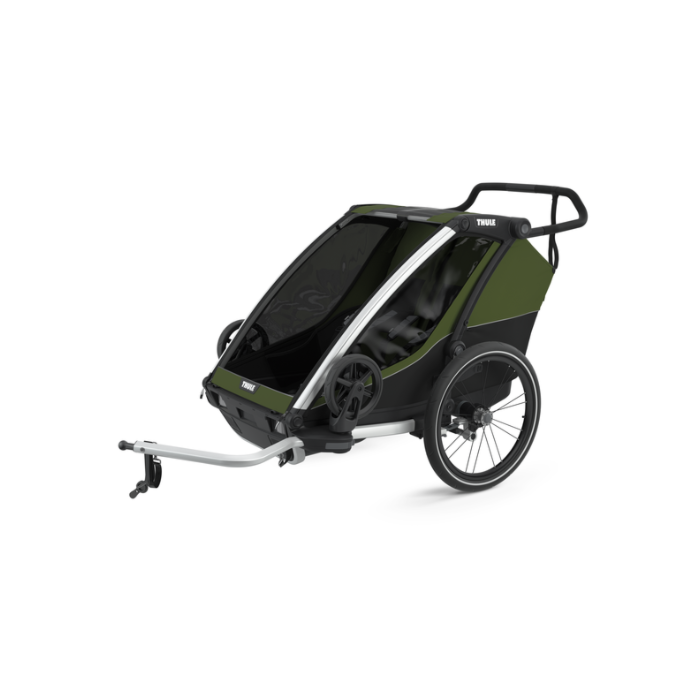 The Chariot Cab 2 model is suitable for 2 children and comes in Cypress Green color. The trailer features ample storage space, adjustable handlebars, and a robust design for durability during outdoor adventures.
