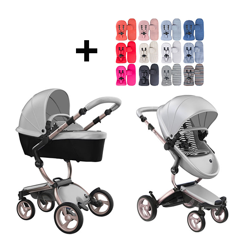 Mima | Poussette Xari | Châssis en Rose Gold | Siège + Capot en Argento | Starter Pack en Noir & Blanc