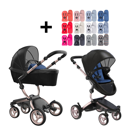 Mima | Poussette Xari | Châssis Rose Gold | Siège et Capot Noir | Starter Pack Denim Blue