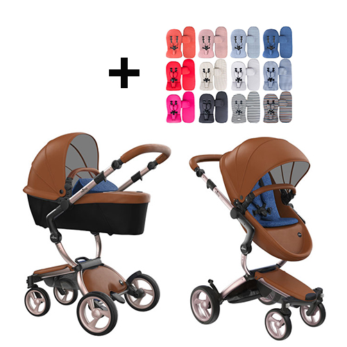 Mima Xari | Poussette | Châssis - Rose Gold | Siège + Capot - Camel | Starter Pack - Denim Blue