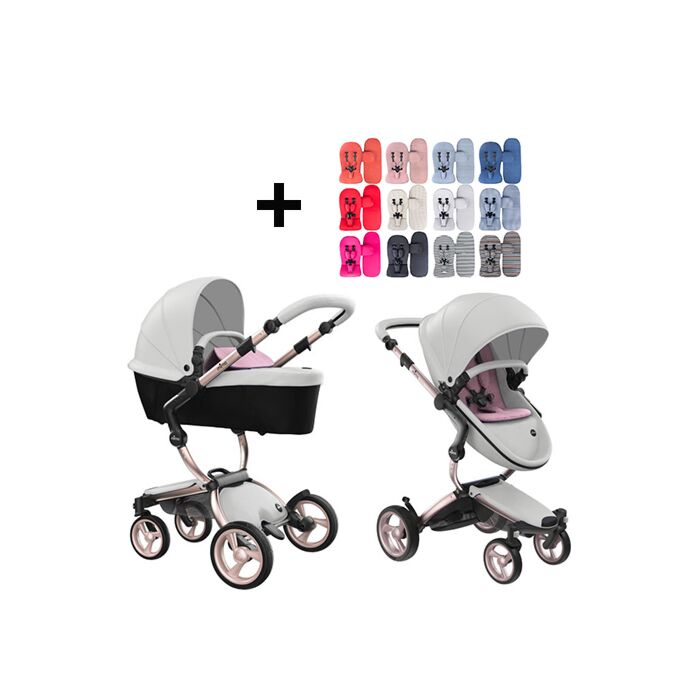 Mima | Poussette Xari | Châssis Rose Gold | Siège + Capot Snow White | Starter Pack Pixel Pink