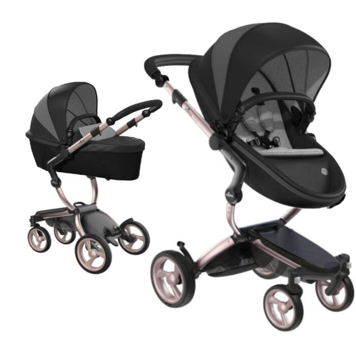 Le châssis de la poussette Mima Xari mesure : Longueur : 103 cm, Largeur : 63 cm, Hauteur : 109 cm lorsqu'il est déplié, et se plie facilement avec des dimensions réduites de Longueur : 100 cm, Largeur : 63 cm, Hauteur : 47 cm avec roulettes. Le châssis est fabriqué en aluminium léger, tandis que le siège est en plastique résistant, avec une texture semblable à du cuir.