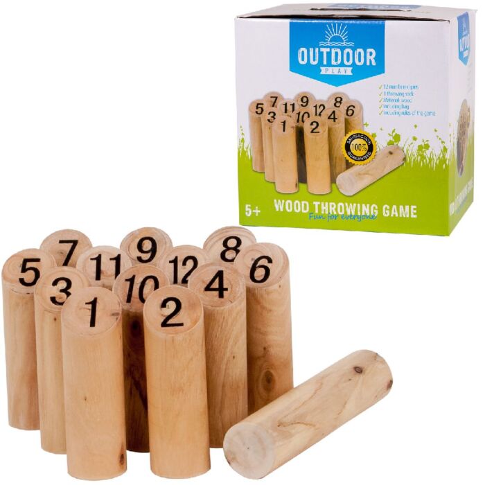Het Outdoor Play Wood Throw Game is een populair werpspel uit Scandinavië dat nu ook gemakkelijk in de tuin gespeeld kan worden. De set bevat 12 genummerde kegels, een werpstokje en een tasje voor eenvoudig opbergen en vervoeren. De kegels hebben een afmeting van 15,3 x 4,7 cm, terwijl het werpstokje 22,5 x 4,7 cm groot is. Gemaakt van duurzaam hout, wordt deze set geleverd in een full-colour doos met een uitgebreide handleiding. Geschikt voor kinderen vanaf 5 jaar, dit spel is perfect om buiten te spelen en plezier te hebben in de frisse lucht.