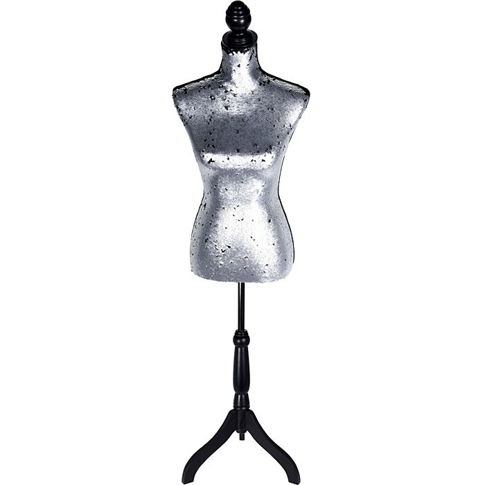 - Door de zilverkleurige pailletten aan de voorkant heeft deze paspop een chiquere uitstraling dan de standaard modellen