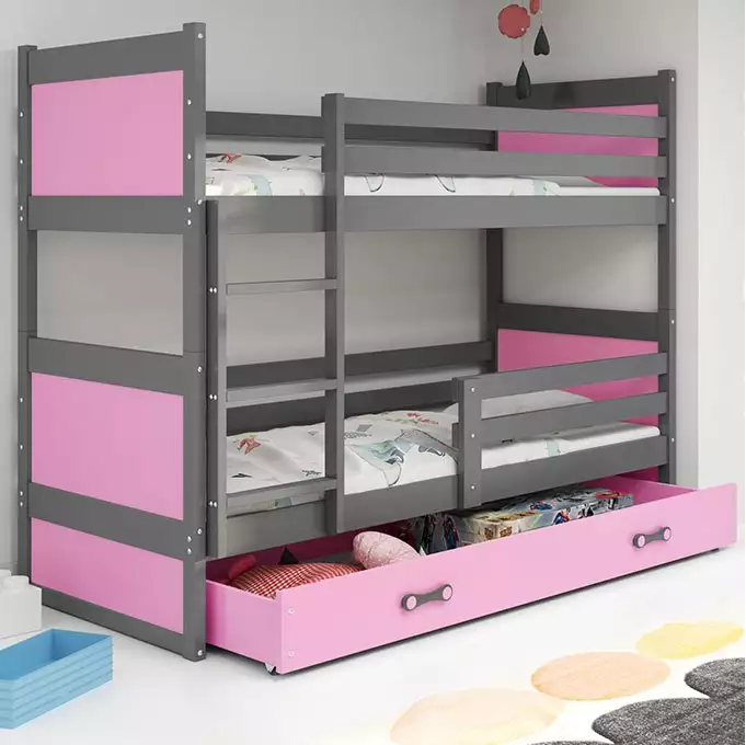 RICO 90X200 Youth Bunk Bed with Mattress and Drawer, Graphite/Pink