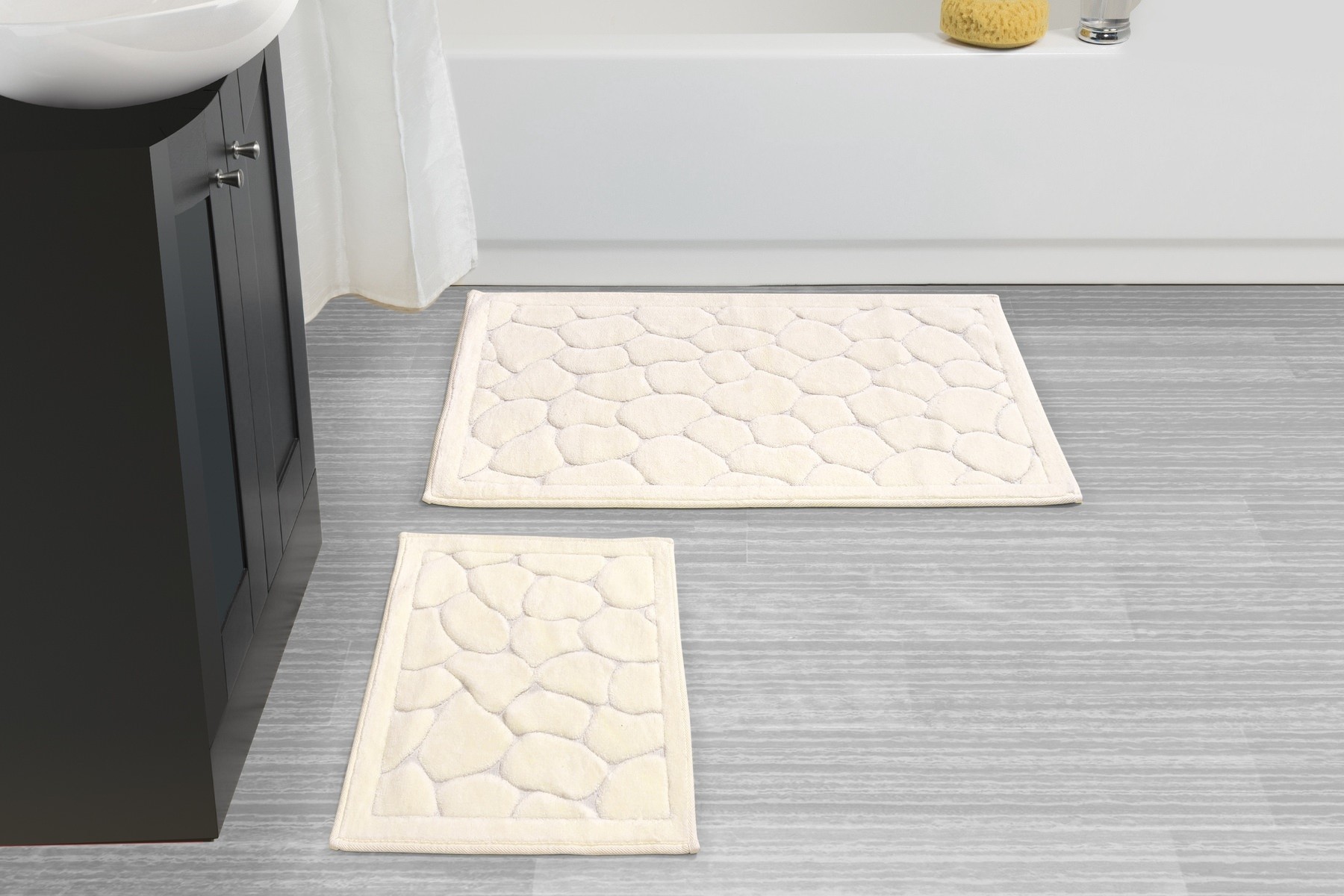 Onze badmattenset heeft twee maten om aan je specifieke behoeften te voldoen. De badmat van 50 x 60 cm is perfect voor kleinere badkamers of als aanvulling op je bestaande inrichting. De grotere badmat van 60 x 100 cm is ideaal voor ruime badkamers of als blikvanger.