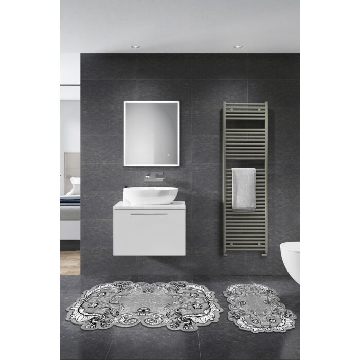 Deze set bestaat uit twee badmatten, één van 50 x 60 cm en de andere van 60 x 100 cm. De strakke grijze kleur voegt een vleugje elegantie toe aan je badkamerinrichting en past moeiteloos bij elke stijl.