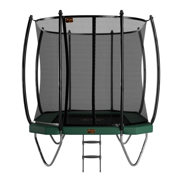 Avyna Pro-Line trampoline met veiligheidsnet 380 x 255 cm (238) – GroenDeze opbouw trampoline inclusief veiligheidsnet behoort tot een van de grotere modellen Avyna Pro-Line trampolines. De trampoline is 3,80 meter lang en 2,55 meter breed. Veel ruimte om te springen dus! Daarnaast is de trampoline 86 cm hoog. Een rechthoekige trampoline neemt over het algemeen minder ruimte in dan een ronde trampoline. Deze rechthoekige trampoline is dus perfect als je optimaal gebruik wil maken van de ruimte in de tuin. Onze trampolines behoren tot het hoge segment trampolines. De trampoline is gemaakt van hoogwaardige kwaliteit materiaal en is uitstekend afgewerkt door middel van veel aandacht voor de kleine details zoals de stiksels. Deze trampoline is voorzien van een Royal Class veiligheidsnet, heeft een stevige groene trampoline rand, dubbel gegalvaniseerde veren, een soepele springmat én een gratis trapje!Al onze Avyna Pro-Line trampolines worden zelf ontworpen en geproduceerd in onze eigen fabriek in Vietnam. We gebruiken hoogwaardig materiaal en op die manier streven we naar hoge kwaliteit, veiligheid en duurzaamheid. Zo leveren wij, in tegenstelling tot andere trampolinemerken, een levenslange garantie op het frame van de trampoline. Daarnaast voldoen al onze trampolines aan de veiligheidseisen. In Amerika zijn onze Pro-Line trampolines zelfs als veiligste én beste getest. Met onze trampolines ben je in ieder geval verzekerd van jarenlang speelplezier!Op zoek naar een trampoline die je kan ingraven?Ook dan ben je aan het juiste adres, ga dan voor een InGround of FlatLevel trampoline. Onze InGround trampolines trampolines komen ongeveer 20 cm boven de grond uit. Onze Flatlevel trampolines zijn gelijk met het maaiveld en hebben daardoor een strakke en mooie uitstraling.