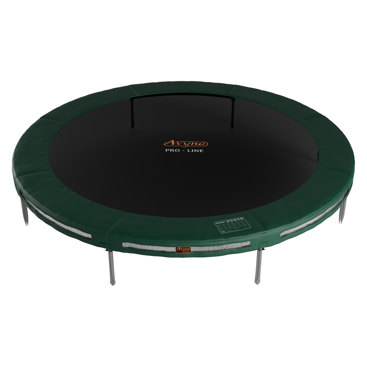 Avyna Pro-Line InGround trampoline set 14 Ø430 cm – Groen      Deze ronde InGround (ingraaf) trampoline heeft een diameter van 4,30 meter en is hiermee de allergrootste ronde Avyna Pro-Line trampoline in ons assortiment. Ben je op zoek naar een grote trampoline? Stop dan met zoeken en ga voor deze gave InGround met een diameter van 430 cm. In tegenstelling tot onze FlatLevel trampolines, komt deze InGround trampoline nog ongeveer 20 cm boven de grond uit. Verder is deze InGround trampoline gemaakt van hoogwaardig en duurzaam materiaal. Kortom, met deze trampoline ben je jarenlang verzekerd van springplezier!De trampoline (430 cm in doorsnee) is voorzien van een groene trampoline rand, dubbel gegalvaniseerde veren en een soepele springmat. De stevige rand van de trampoline dekt de veren volledig af en blijft daarnaast netjes liggen bij iedere sprong. Extra veilig dus. De zijkant (skirt) van het randkussen valt volledig langs de open ruimte (20 cm) heen. Zo kan er niets onder de trampoline terecht komen. Het randkussen is ook voorzien van luchtroosters voor een optimaal springcomfort. Onze InGround (20 cm boven de grond) en FlatLevel (volledig gelijk met de grond) trampolines zijn steeds populairder. Het frame van deze trampolines wordt verwerkt in de grond. Dit zorgt voor een strakke uitstraling omdat de trampoline zo een geheel wordt met de tuin. Ook zijn deze trampolines super veilig vanwege de lage op- en afstap.Al onze Avyna Pro-Line trampolines worden zelf ontworpen en geproduceerd in onze eigen fabriek in Vietnam. Met een Avyna Pro-Line trampoline haal je kwaliteit, veiligheid en duurzaamheid in huis. Dankzij de zware kwaliteit materialen hebben onze trampolines een enorm lange levensduur. Dit is zeker iets waar we trots op zijn. Om die reden bieden we, in tegenstelling tot andere trampoline merken dan ook levenslangs garantie op het frame van de trampoline. Bovendien zijn onze trampolines uitstekend afgewerkt en besteden we veel aandacht aan de kleine details, zoals de stiksels. Dit bij elkaar opgeteld, zorgt ervoor dat Avyna Pro-Line trampolines tot het hoge segment behoren. Uiteraard voldoet ons assortiment trampolines aan de laatste veiligheidseisen. In Amerika zijn ze zelfs als beste getest.