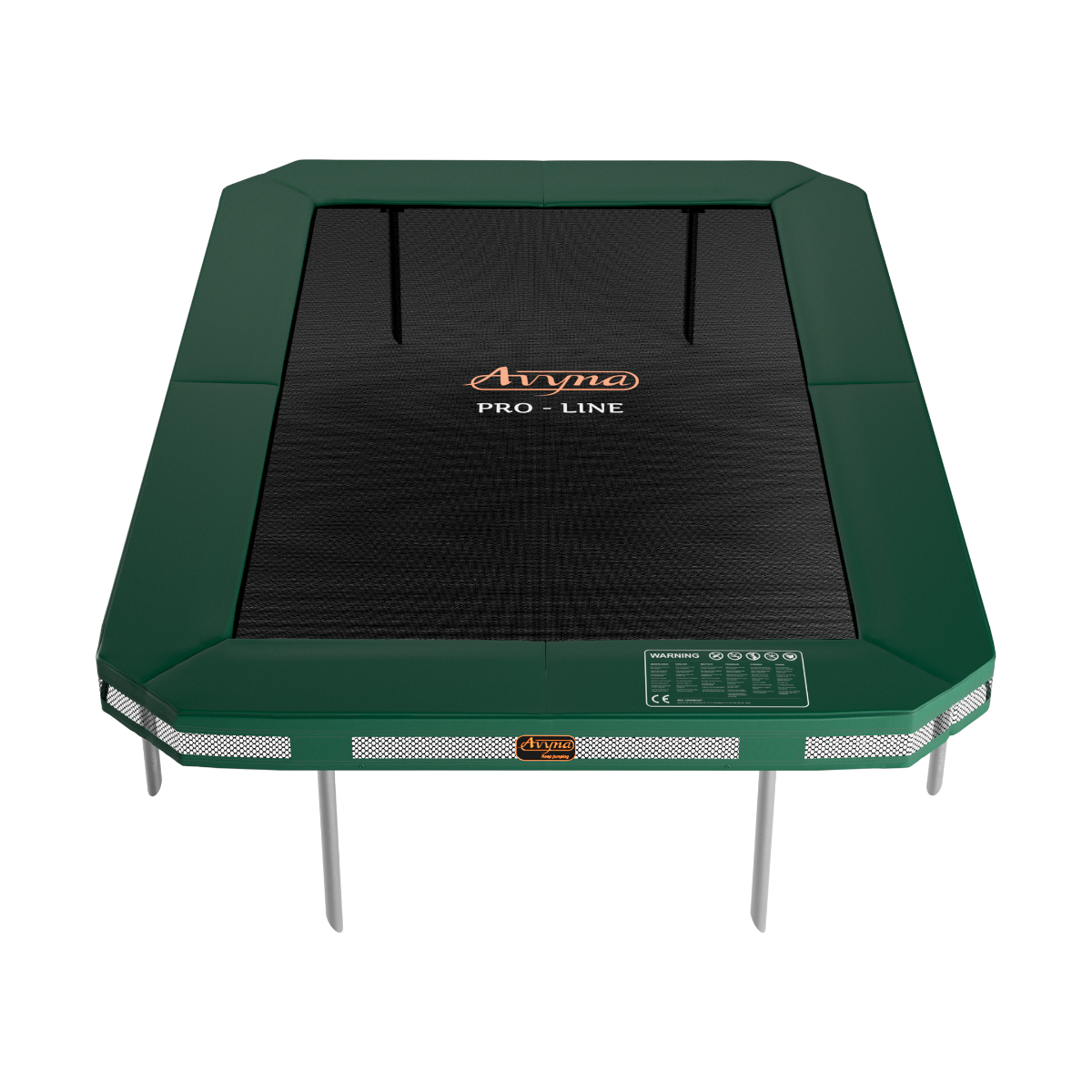 Avyna Pro-Line InGround trampoline 340 x 240 cm (234) – GroenDeze rechthoekige InGround (ingraaf) trampoline heeft een afmeting van 3,40 x 2,40 meter. Deze Avyna Pro-Line trampoline 234 behoort tot de middelmaat modellen. De trampoline komt nog zo’n 20 cm boven de grond uit, in tegenstelling tot onze FlatLevel trampolines. FlatLevel trampolines graaf je namelijk helemaal in, waardoor deze volledig gelijk is met het maaiveld.Deze InGround trampoline van 340 x 240 x 20 cm is voorzien van een groene trampoline rand, dubbel gegalvaniseerde veren en een soepele springmat. De stevige rand van de trampoline dekt de veren volledig af en blijft netjes liggen bij iedere sprong. De zijkant (skirt) van het randkussen valt volledig langs de open ruimte (20 cm) heen. Zo kan er niets onder de trampoline terecht komen. Het randkussen is ook voorzien van luchtroosters voor een optimaal springcomfort. Met het hoogwaardig en duurzaam materiaal van deze trampoline ben je in ieder geval jarenlang verzekerd van veel springplezier!Al onze Avyna Pro-Line trampolines worden zelf ontworpen en geproduceerd in onze eigen fabriek in Vietnam. Met een Avyna Pro-Line trampoline haal je kwaliteit, veiligheid en duurzaamheid in huis. Dankzij de zware kwaliteit materialen hebben onze trampolines een enorm lange levensduur. Dit is zeker iets waar we trots op zijn. Om die reden bieden we, in tegenstelling tot andere trampoline merken dan ook levenslange garantie op het frame van de trampoline. Bovendien zijn onze trampolines uitstekend afgewerkt en besteden we veel aandacht aan de kleine details, zoals de stiksels. Dit bij elkaar opgeteld, zorgt ervoor dat Avyna Pro-Line trampolines tot het hoge segment behoren. Uiteraard voldoet ons assortiment trampolines aan de laatste veiligheidseisen. Al onze trampolines hebben een CE markering, zijn EN 7114 gekeurd én bezitten een EN 1176 certificering.