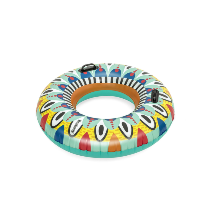 Het Flirty Fiesta ontwerp zorgt voor een leuke en kleurrijke uitstraling in het water. De ring is gemakkelijk op te blazen en biedt een comfortabele zitplaats tijdens het zwemmen.