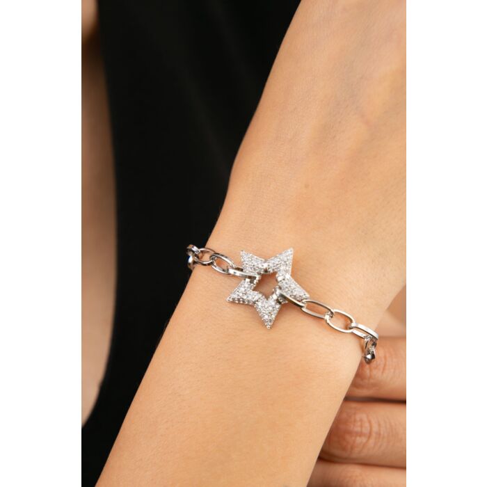 Het ingewikkelde ontwerp van onze metalen armband is versierd met zirkonia's en voegt een vleugje glamour en glans toe aan je pols. De zilveren kleur past bij elke outfit, waardoor het een veelzijdig accessoire is dat bij elke gelegenheid gedragen kan worden.