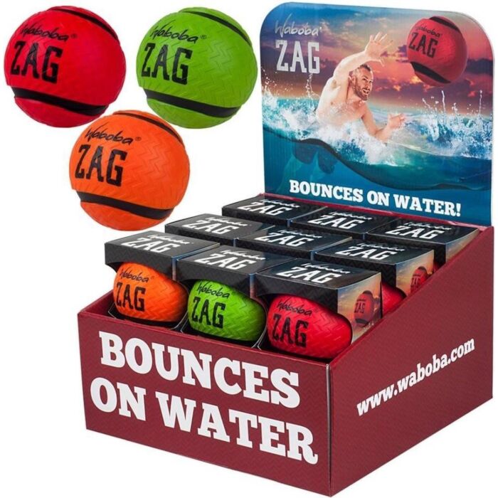 Waboba Zag bal. Grote water-stuiterbal met een doorsnede van 9 cm. De bal is gemaakt van stevig foammateriaal met 3D reliëf-oppervlak voor extra grip. Verkrijgbaar in 3 hippe kleuren: verpakt in display van 18 stuks. Het ideale zomerspeelgoed! Geschikt voor kinderen vanaf 6 jaar.