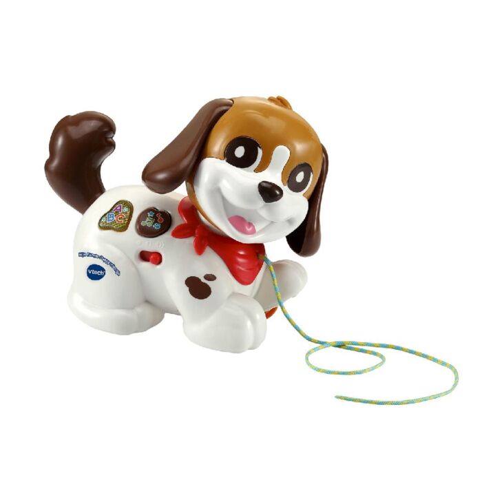 De interactieve knuffelhond van Vtech biedt verschillende functies zoals geluiden en lichteffecten om educatieve interactie te stimuleren. Het ontwerp is knuffelbaar en veilig voor jonge kinderen om mee te spelen.