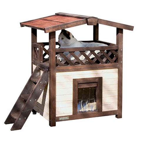 Dit sfeervolle kattenhuis is geschikt voor alle seizoenen. Het kattenhuis beschikt over een geïsoleerde bodem, dubbele zijwanden, waterbestendig bitumen dak en heeft transparante lamellen bij de ingang ter bescherming van wind en regen