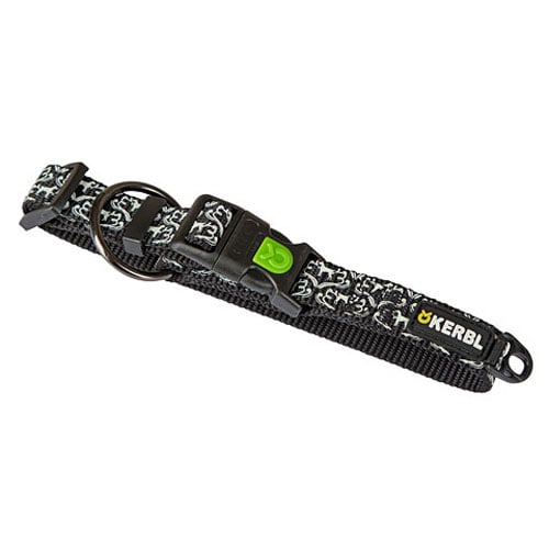 Deze nylon halsband is voorzien van een sterk reflecterende print welke blijft doorschijnen in het donker zodat de hond ten alle tijden goed zichtbaar is. De halsband is traploos verstelbaar en voorzien van sterk beslag.