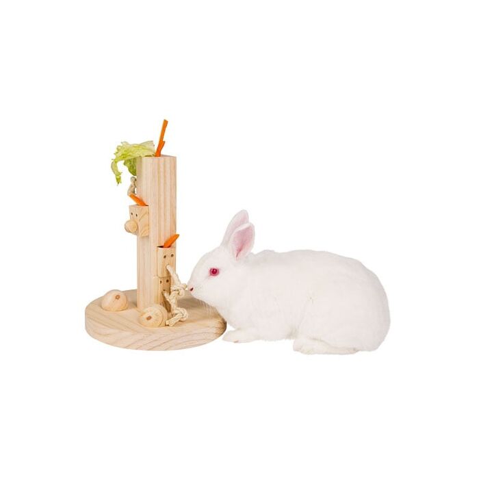Deze leuke interactieve speelboom is de musthave voor ieder nieuwsgierig konijntje of cavia. De speelboom is vervaardigd uit hout en bevat verschillende niveaus van moeilijkheid. Door te schuiven, trekken, rollen of liften komt er een lekkernij tevoorschijn als beloning. Door deze verscheidenheid blijft de speelboom altijd vol uitdaging voor uw knaagdier
