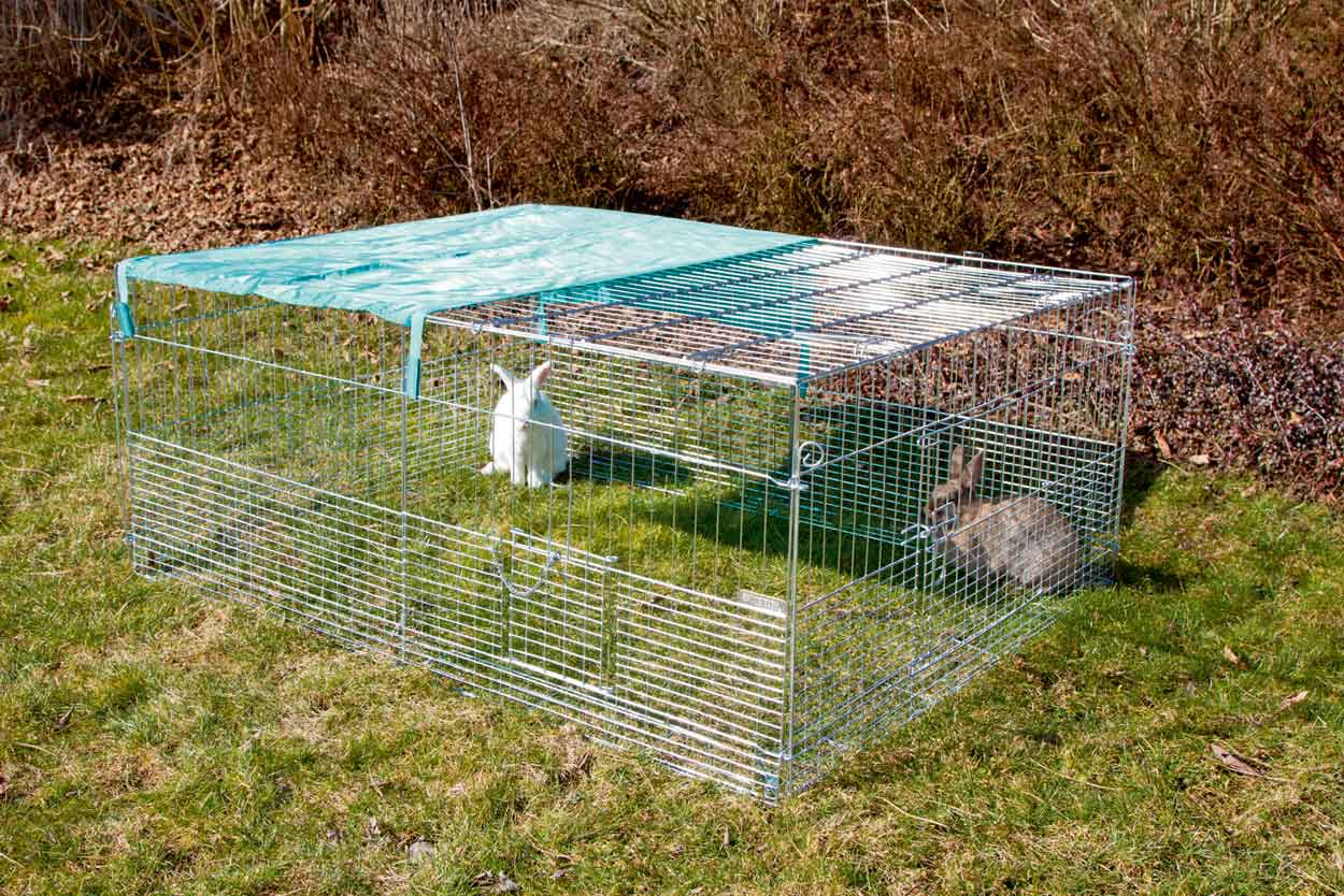 Ruime verzinkte konijnenren geschikt voor (jonge) konijnen, cavia's en kippen. De verkleinde mazen onderin maakt de ren ook geschikt voor jonge dieren. Inclusief zonnescherm en voorzien van anti uitgraaf systeem