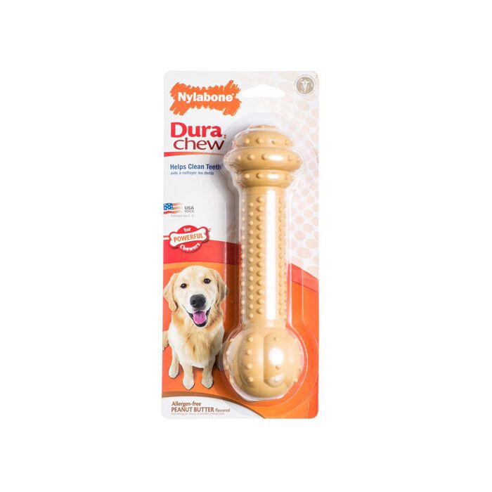 Is je hond een liefhebber van kauwen dan is een Nylabone de perfecte oplossing. Dit kauwbot is bijna onverwoestbaar en heeft een heerlijke pindakaas smaak. De Nylabone durchew kauwbotten zijn hypoallergeen en ontwikkeld voor honden met fanatieke kauwbehoeftes
