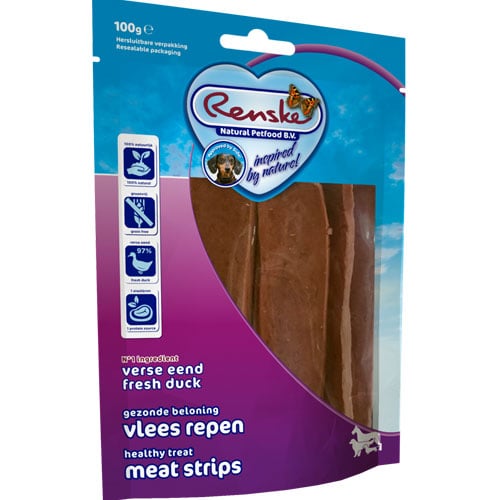 Renske vleesrepen van gedroogd puur eenden vlees, zonder granen, zout, suiker of kunstmatige toevoegingen. Renske vleesrepen voorzien in de natuurlijke dagelijkse kauwbehoefte van je hond en dragen bij aan een goede en gezonde verzorging van de tanden en beschermen tegen tandsteen en tandplak.