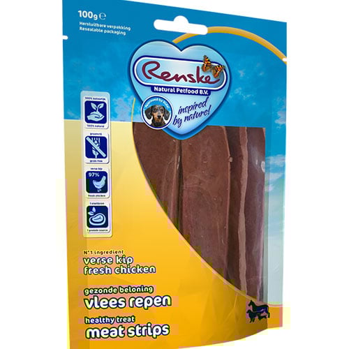 Renske vleesrepen van gedroogd puur kippen vlees, zonder granen, zout, suiker of kunstmatige toevoegingen. Renske vleesrepen voorzien in de natuurlijke dagelijkse kauwbehoefte van je hond en dragen bij aan een goede en gezonde verzorging van de tanden en beschermen tegen tandsteen en tandplak.