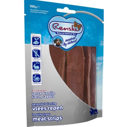 Renske vleesrepen van gedroogd puur konijnen vlees, zonder granen, zout, suiker of kunstmatige toevoegingen. Renske vleesrepen voorzien in de natuurlijke dagelijkse kauwbehoefte van je hond en dragen bij aan een goede en gezonde verzorging van de tanden en beschermen tegen tandsteen en tandplak.