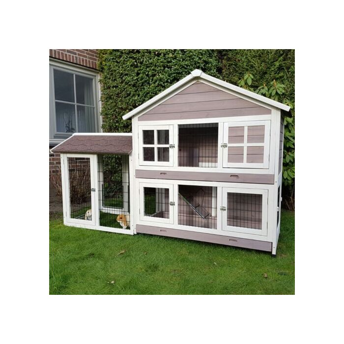 Het konijnenhok is voorzien van twee diepe lades, 4 openslaande deuren en anti-knaagstrips. Door een uitneembaar paneel in de linker zijwand van het hok kunnen de konijnen makkelijk de ren in- en uitlopen. Ook de ren is voorzien van anti-knaagstrips.