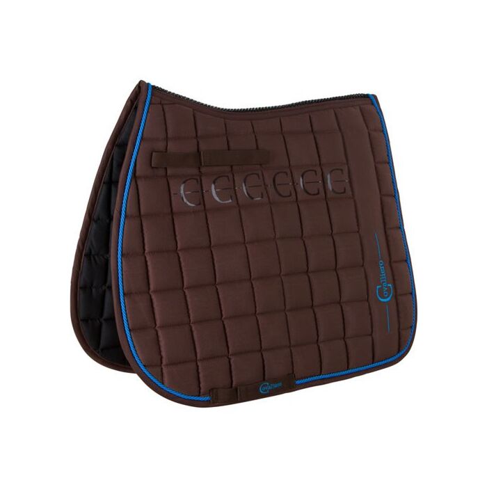Dit zadeldekje is van zeer hoge kwaliteit en netjes afgewerkt met een blauwe bies. Het dekje is gevuld met stevig schuim en aan de boven-en zijkant voorzien van een siliconenprint voor extra grip.