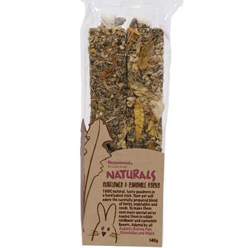 Deze overheerlijke sticks met zonnebloem en kamille smaak zijn een traktatie die jouw konijn of knaagdier niet kan weerstaan. De sticks kun je aan het koordje ophangen in het hok of in de ren of gewoon neerleggen. Deze sticks zitten vol kruiden, groenten en zaden en zijn bedekt met een laagje eetbare zonnebloem en kamille.