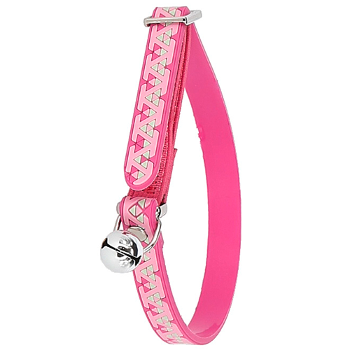 Deze roze kattenhalsband is vervaardigd uit PVC en voorzien van een bel en elastische inzet. Door de elastische inzet en de schuifsluiting kan het bandje in noodgevallen makkelijker afgaan voor de veiligheid van de kat.