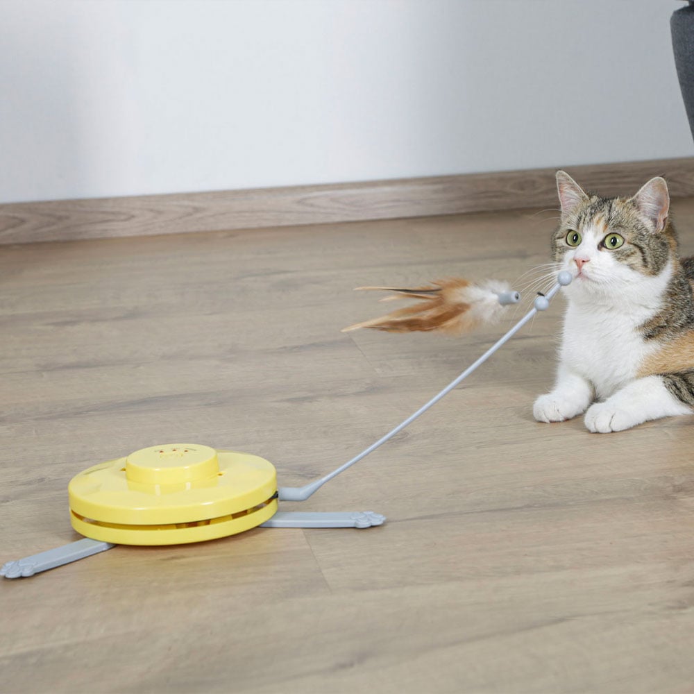 Dit kattenspeeltje is super leuk om je kat te prikkelen en bezig te houden. Het speeltje heeft twee verschillende opties. Een roterende hengel met veer of een roterende hengel onder een mat. Door de drie verschillende standen kan je ook nog eens de snelheid bepalen.