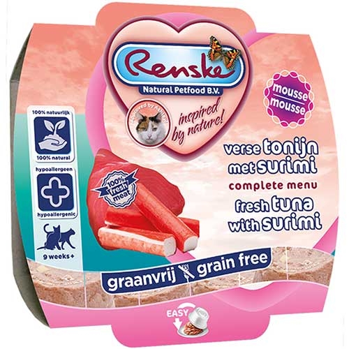 Renske verse tonijn en surimi mousse is een complete kattenvoeding geschikt voor katten vanaf 9 weken oud. De ingredienten zijn 100% natuurlijk en vrij van kunstmatige conserveringsmiddelen, geur- en kleurstoffen, antioxidanten en toegevoegde suikers. Ook is de voeding geheel graanvrij.