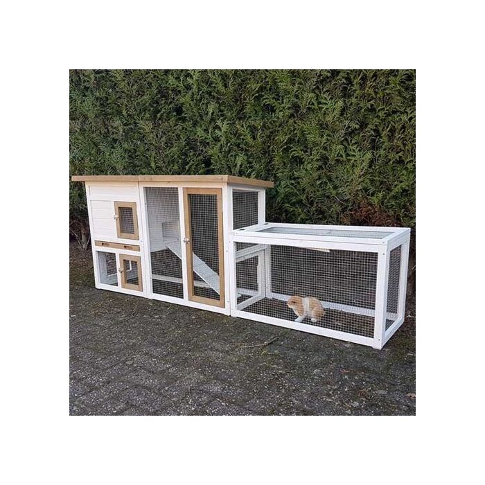 Eventueel is dit konijnenhok ook nog onbeperkt uit te breiden met de konijnenren Univers. Het hok beschikt namelijk over een uitneembare zijwand aan beide kanten. Je kunt de ren daardoor zowel links- als rechts van het hok plaatsen om de ruimte voor je konijnen te vergroten. Ook is het mogelijk om er nog een konijnenhok NOrma aan te koppelen. Wel dient u dit te doen met de konijnen Univers ertussen.